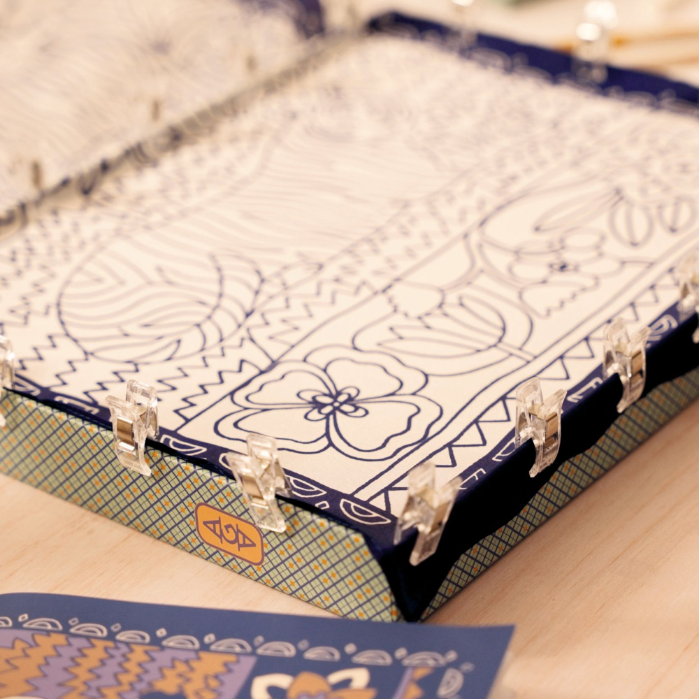 1 hodvábna šatka pripravená na maľovanie (rozmery 130 x 34 cm) s prednanesenou „guttou“ na obrys vzorov, 20 šijacích sponiek, 4 x 30 ml fľaštičky s farbou na hodváb, 2 štetce, 1 držiak na štetce, 1 šablóna na dodržanie návodu a Brožúra + karta s QR kódom vedúca k video tutoriálu aktivity.