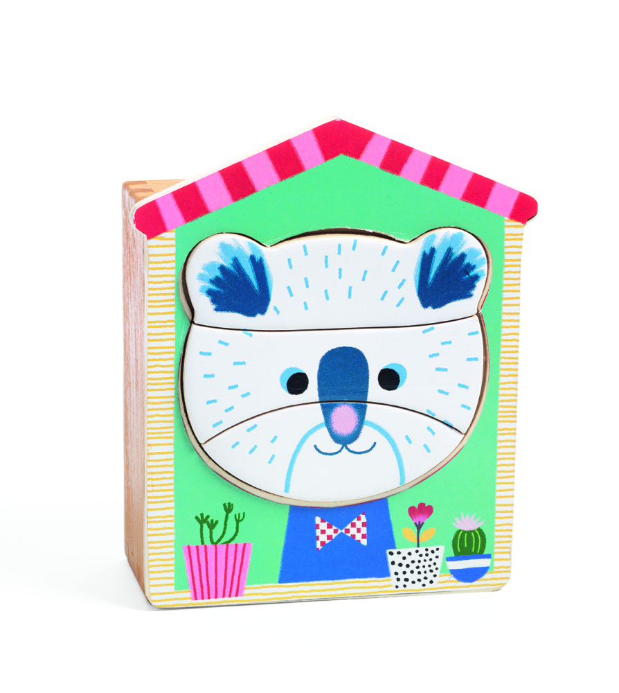 Dieliky dreveného puzzle sú uložené v drevenej škatuli v tvare domčeka. Posuvný vrchnák škatule slúži zároveň ako podložka pre skladanie zvieracích tvárí. Podložka je univerzálna, dieliky sa dajú ľubovoľne zamieňať, z čoho môžu vzniknúť zaujímavé kombinácie – pokojne nechajte dieťaťu voľnú ruku. Cieľom je zložiť ucelenú tvár.