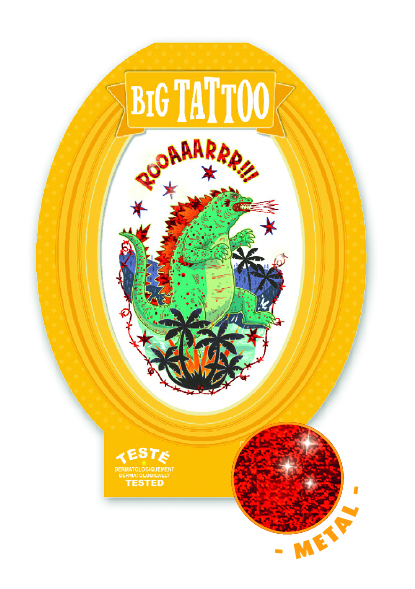 Veľké kompaktné tetovanie s detailnou kresbou. Fantastický motív monštruóznej Godzilly. S metalickou vrstvou. Vynikne na ramene, pleci, hrudi alebo lýtku. Dermatologicky testované. Jednoduchá aplikácia na čistú pokožku.